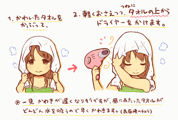 これは髪の毛を乾かすためのちょっとした裏技(?)となるのですが、タオルを髪の毛に当てて、その上からドライヤーすることでかなり早く髪の毛を乾かすことが可能です。